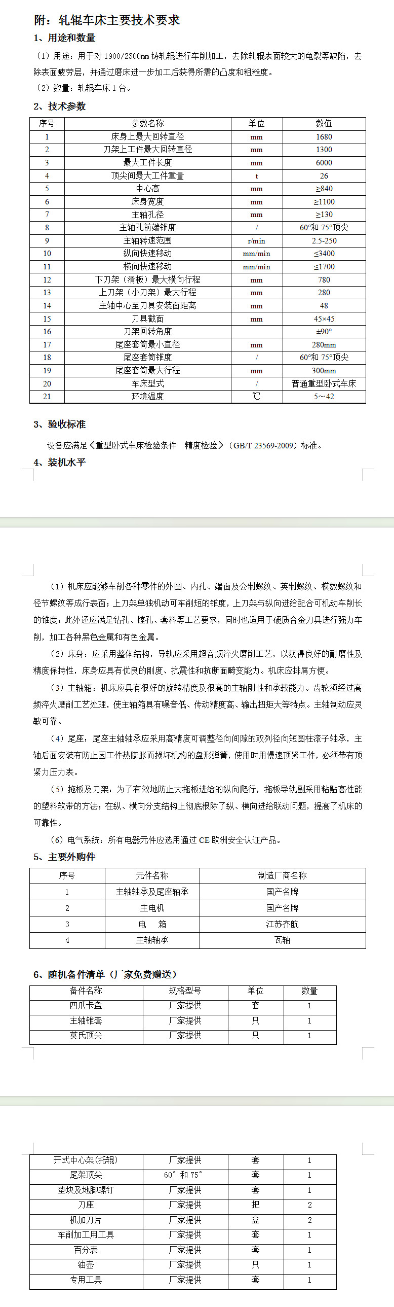2、工程(項(xiàng)目)規(guī)模:合同范圍包括軋輥車(chē)床裝置1臺(tái),供貨范圍為車(chē)床全套設(shè)備、各工藝系統(tǒng)、附屬設(shè)施及輔材,以及滿足設(shè)備正常生產(chǎn)運(yùn)行所包含的其他全部?jī)?nèi)容,包含但不限于:設(shè)計(jì)、制造、包裝、裝卸、運(yùn)輸、保險(xiǎn)、安裝調(diào)試、備品備件、技術(shù)指導(dǎo)、員工培訓(xùn)、質(zhì)量保修等內(nèi)容。(技術(shù)標(biāo)準(zhǔn)和要求詳見(jiàn)招標(biāo)文件)。乙方在合同簽訂后15日內(nèi),需向甲方及設(shè)計(jì)院提供標(biāo)的物基礎(chǔ)圖及相關(guān)資料。