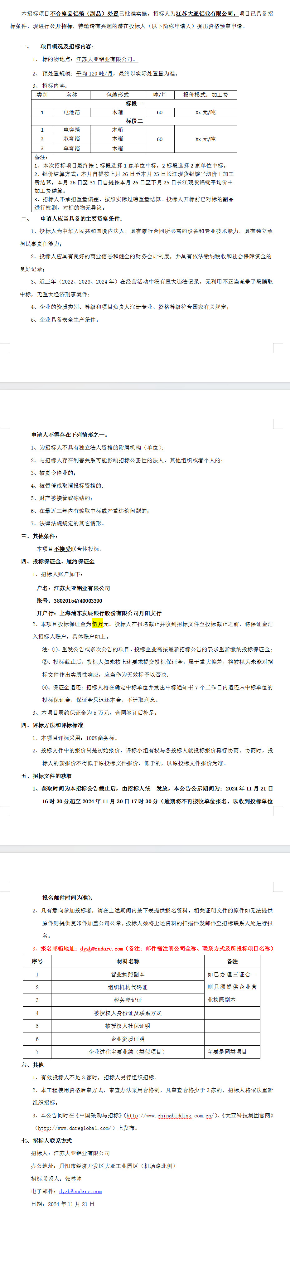 江蘇大亞鋁業有限公司 不合格品鋁箔(副品)處置招標公告