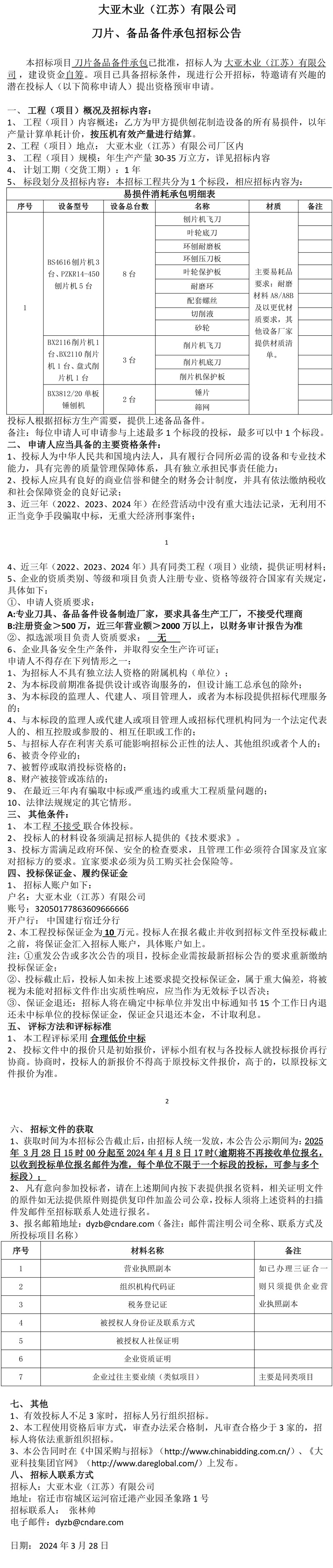 大亞木業(yè)(江蘇)有限公司刀片、備品備件承包招標(biāo)公告