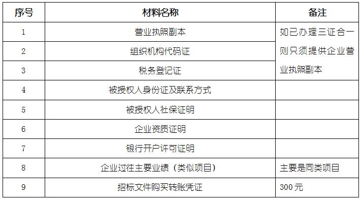 2、 凡有意向參加投標者,請在上述期間內按下表提供報名資料,相關證明文件的原件如無法提供原件則提供復印件加蓋公司公章,投標人須將上述資料的掃描件發郵件至招標聯系人處進行報名。