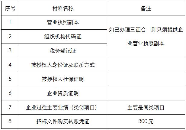 2、凡有意向參加投標(biāo)者,請(qǐng)?jiān)谏鲜銎陂g內(nèi)按下表提供報(bào)名資料,相關(guān)證明文件的原件如無法提供原件則提供復(fù)印件加蓋公司公章,投標(biāo)人須將上述資料的掃描件發(fā)郵件至招標(biāo)聯(lián)系人處進(jìn)行報(bào)名。