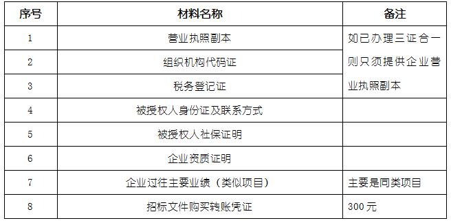 2、 凡有意向參加投標(biāo)者,請(qǐng)?jiān)谏鲜銎陂g內(nèi)按下表提供報(bào)名資料,相關(guān)證明文件的原件如無(wú)法提供原件則提供復(fù)印件加蓋公司公章,投標(biāo)人須將上述資料的掃描件發(fā)郵件至招標(biāo)聯(lián)系人處進(jìn)行報(bào)名。