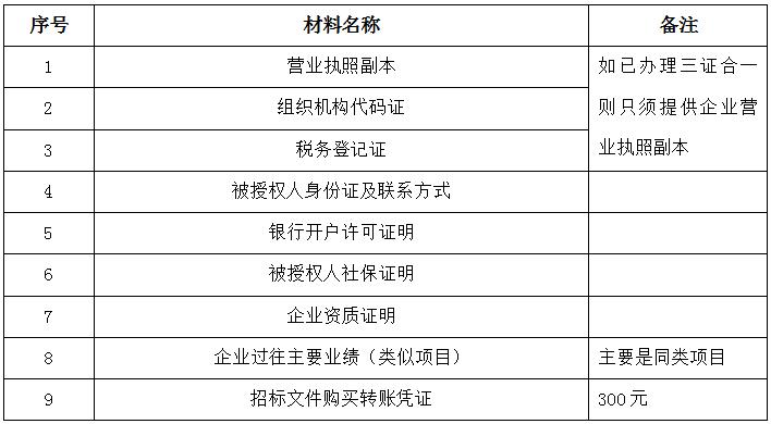 2、 凡有意向參加投標者,請在上述期間內按下表提供報名資料,相關證明文件的原件如無法提供原件則提供復印件加蓋公司公章,投標人須將上述資料的掃描件發郵件至招標聯系人處進行報名。