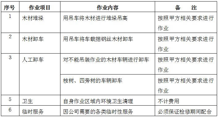 2.1.1滿足我方24小時不間斷作業,將入場木材按要求堆卸到我方指定區域和吊裝高度不低于8m。