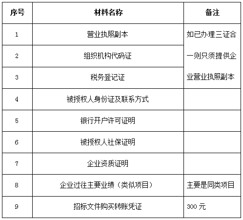 2、 凡有意向參加投標(biāo)者,請(qǐng)?jiān)谏鲜銎陂g內(nèi)按下表提供報(bào)名資料,相關(guān)證明文件的原件如無(wú)法提供原件則提供復(fù)印件加蓋公司公章,投標(biāo)人須將上述資料的掃描件發(fā)郵件至招標(biāo)聯(lián)系人處進(jìn)行報(bào)名。