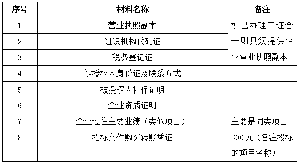 2、凡有意向參加投標者,請在上述期間內按下表提供報名資料,相關證明文件的原件如無法提供原件則提供復印件加蓋公司公章,投標人須將上述資料的掃描件發郵件至招標聯系人處進行報名。