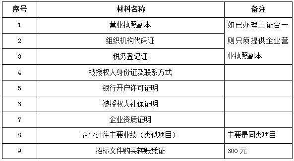 2、 凡有意向參加投標者,請在上述期間內(nèi)按下表提供報名資料,相關(guān)證明文件的原件如無法提供原件則提供復(fù)印件加蓋公司公章,投標人須將上述資料的掃描件發(fā)郵件至招標聯(lián)系人處進行報名。