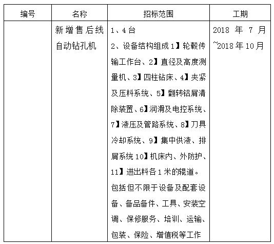 本招標項目 新增售后線自動鉆孔機(項目名稱)已批準建設,招標人為 大亞車輪制造有限公司,建設資金來自自籌 (資金來源)。項目已具備招標條件,現進行公開招標,特邀請有興趣的潛在投標人(以下簡稱申請人)提出資格預審申請。