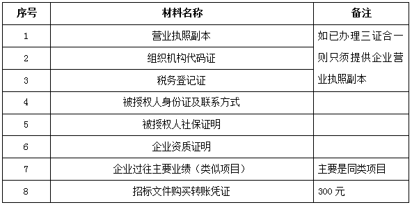 2、 凡有意向參加投標者,請在上述期間內按下表提供報名資料,相關證明文件的原件如無法提供原件則提供復印件加蓋公司公章,投標人須將上述資料的掃描件發郵件至招標聯系人處進行報名。