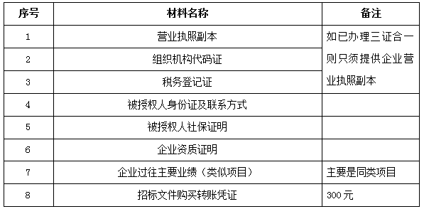 2、 凡有意向參加投標(biāo)者,請(qǐng)?jiān)谏鲜銎陂g內(nèi)按下表提供報(bào)名資料,相關(guān)證明文件的原件如無(wú)法提供原件則提供復(fù)印件加蓋公司公章,投標(biāo)人須將上述資料的掃描件發(fā)郵件至招標(biāo)聯(lián)系人處進(jìn)行報(bào)名。