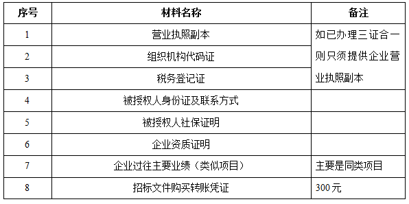 2、 凡有意向參加投標(biāo)者,請(qǐng)?jiān)谏鲜銎陂g內(nèi)按下表提供報(bào)名資料,相關(guān)證明文件的原件如無法提供原件則提供復(fù)印件加蓋公司公章,投標(biāo)人須將上述資料的掃描件發(fā)郵件至招標(biāo)聯(lián)系人處進(jìn)行報(bào)名。
