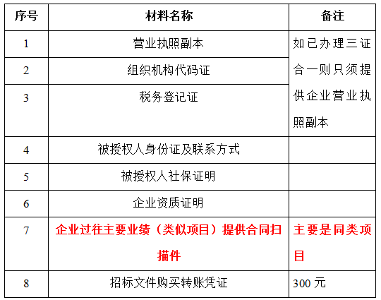 2、 凡有意向參加投標者,請在上述期間內按下表提供報名資料,相關證明文件的原件如無法提供原件則提供復印件加蓋公司公章,投標人須將上述資料的掃描件發郵件至招標聯系人處進行報名。