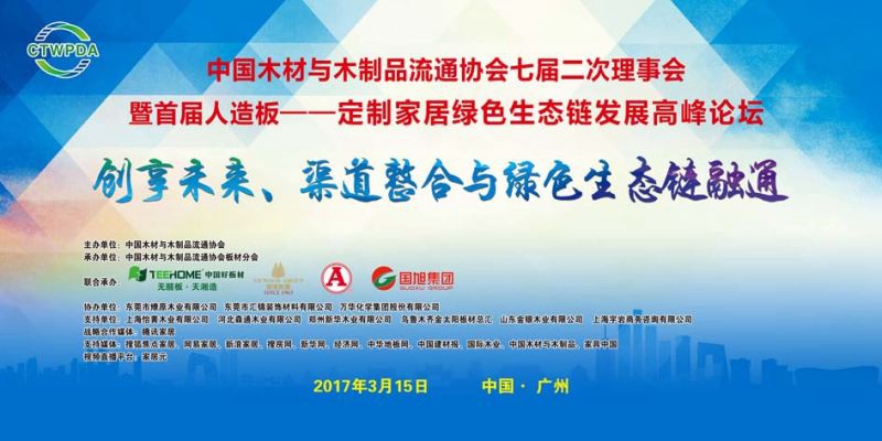 2017年3月15日,中國(guó)木材與木制品流通協(xié)會(huì)在廣州召開(kāi)主題為“創(chuàng)享未來(lái)、渠道整合與綠色生態(tài)鏈融通”的首屆人造板——定制家居綠色生態(tài)鏈發(fā)展高峰論壇。