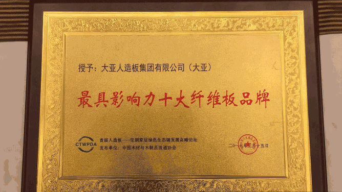 會(huì)上,中國(guó)木材與木制品流通協(xié)會(huì)隆重揭曉最具影響力十大纖維板品牌等獎(jiǎng)項(xiàng), 大亞人造板集團(tuán)有限公司(大亞牌)以優(yōu)秀的產(chǎn)品品質(zhì)、卓越的市場(chǎng)影響力榮膺十大纖維板品牌之首。該獎(jiǎng)項(xiàng)是對(duì)十幾年如一日專注于環(huán)保板材生產(chǎn)與流通的大亞人造板的充分肯定與鼓勵(lì)。